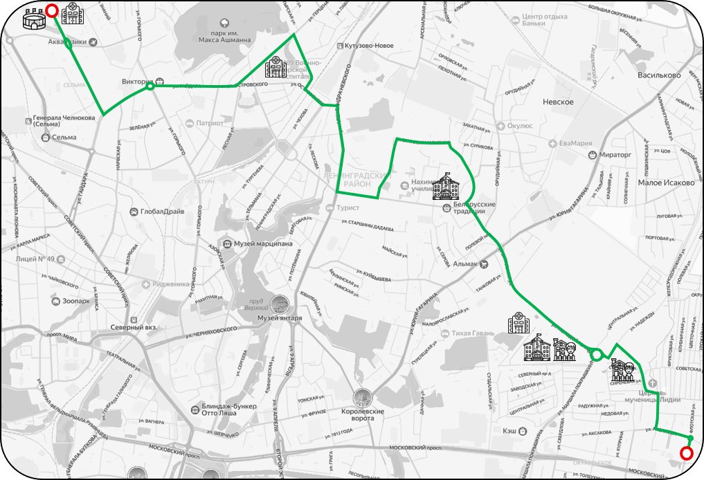 Маршрут нового общественного транспорта пройдет по улицам: Флотская — Аксакова — Зорге — Денисова — Михайловская — 3-го Белорусского фронта — Брестская — Денисова — Молодой гвардии — Орудийная — Аэропортная — Артиллерийская–Мариенко — Лучинского — Артиллерийская — Невского — Островского — Колхозная — Герцена — Островского — Гайдара — Согласия.