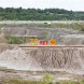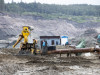 Второй экскаватор высыпает голубую глину в большой конус, который потом размывают морской водой под огромным давлением. После этого поток из воды, глины и янтаря бежит по руслу, где рабочие с большими сачками извлекают из потока крупные камни.